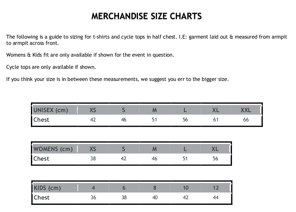 > Check the width/chest measurements (armpit to armpit across chest) before ordering. We are not able to exchange sizes once your order is placed. > Merchandise is collected with your race pack at the pre-race registration the day before the race.
