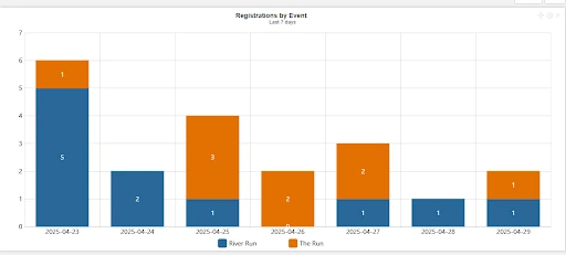 Daily Registration Graph - Track registration trends by day, broken down by event - view insights for the past 7, 30, or 90 days to monitor growth and activity over time. Updated Stats Widget - Now includes Team and Group statistics for a clearer overview of event participation.